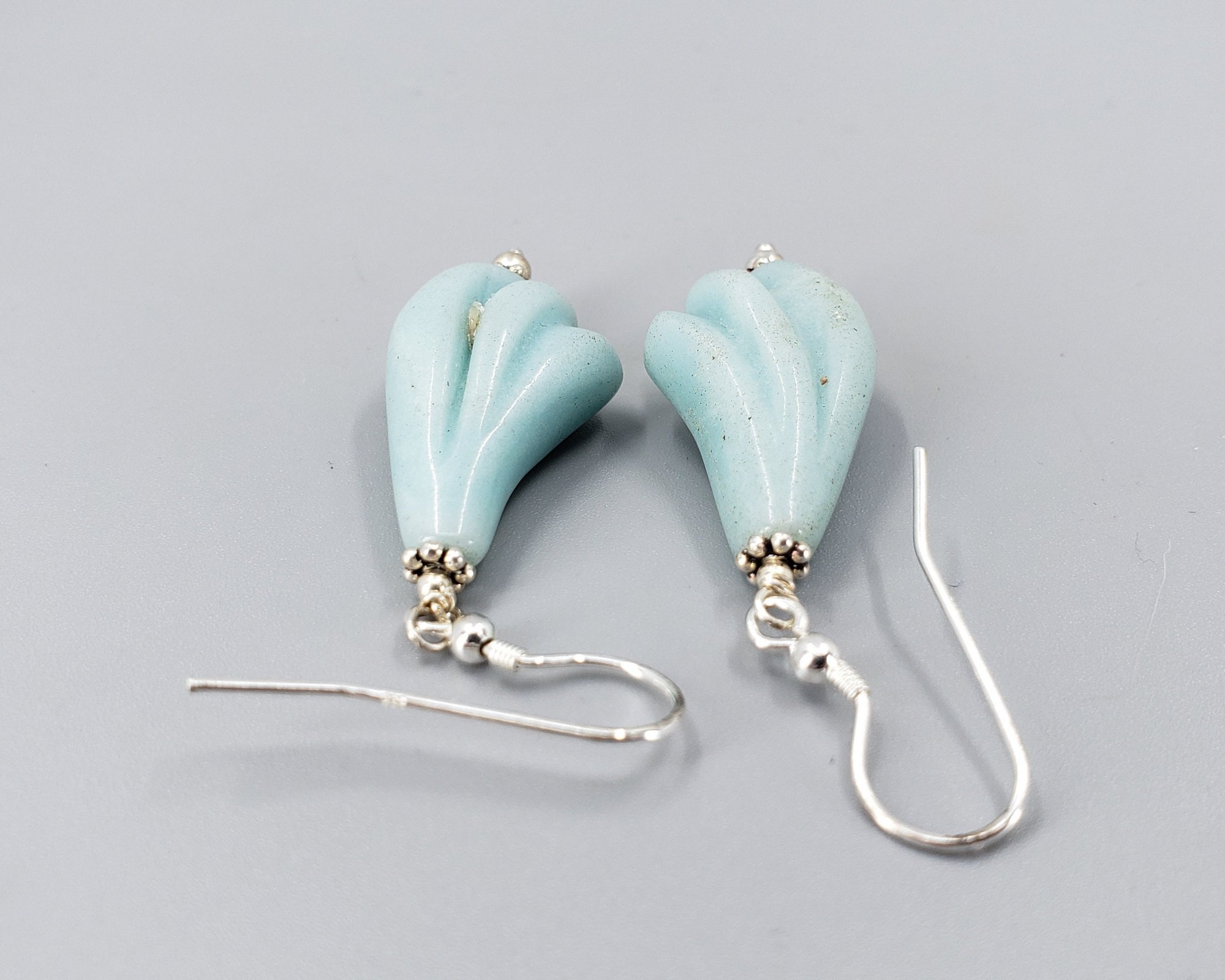 These beautiful earrings are made from hand-carved Amazonite beads and a variety of sterling beads. The ear wires and all findings are sterling as well.