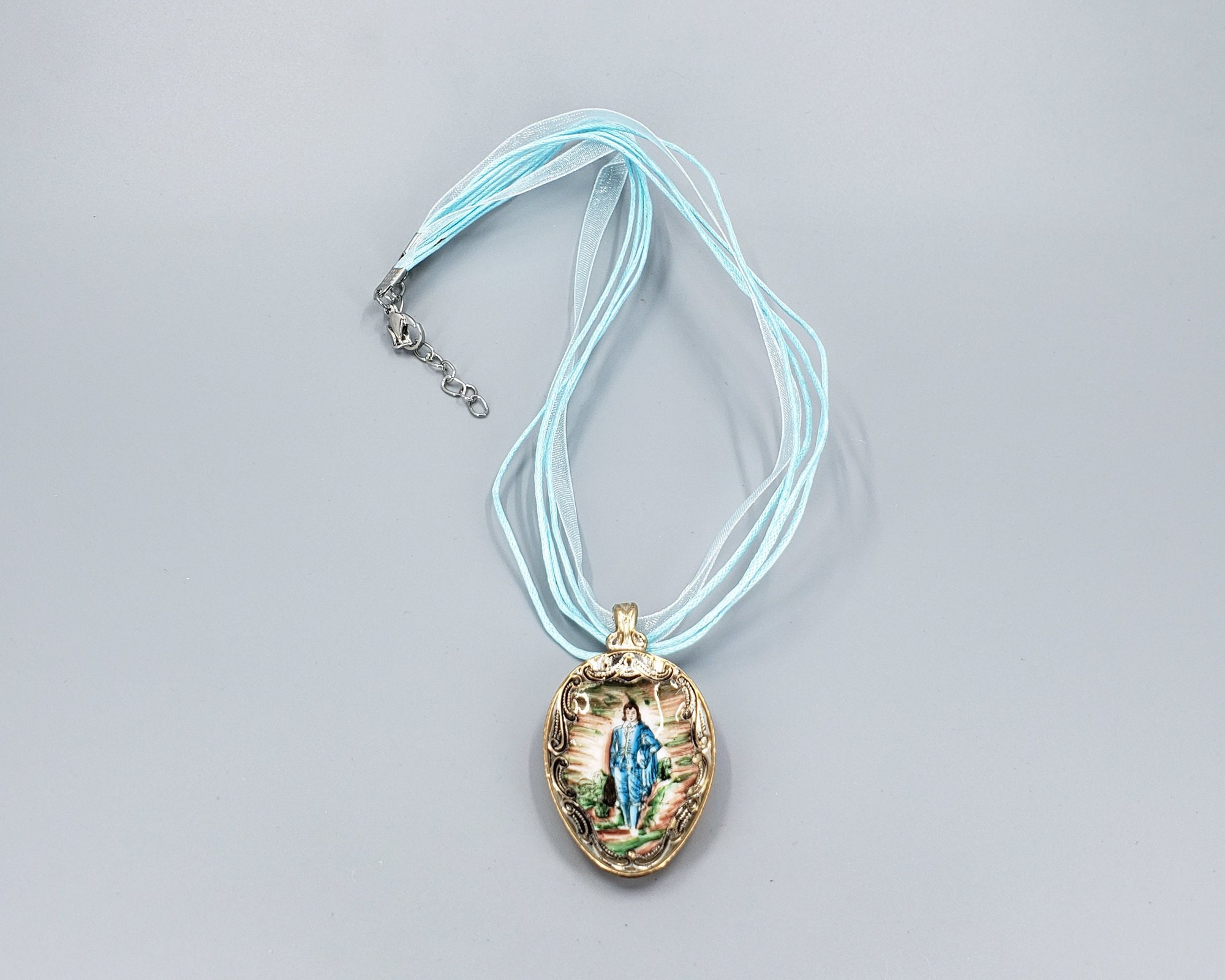 This beautiful pendant used to be a collector spoon! It is silver plated brass, and features a Limoges-style hand painted enamel of the Thomas Gainsborough painting "The Blue Boy" in the bowl. It measures 2in X 1in. Most of the plating is worn on the back, there is enough left on the front where it makes a cool accent to the brass.