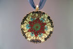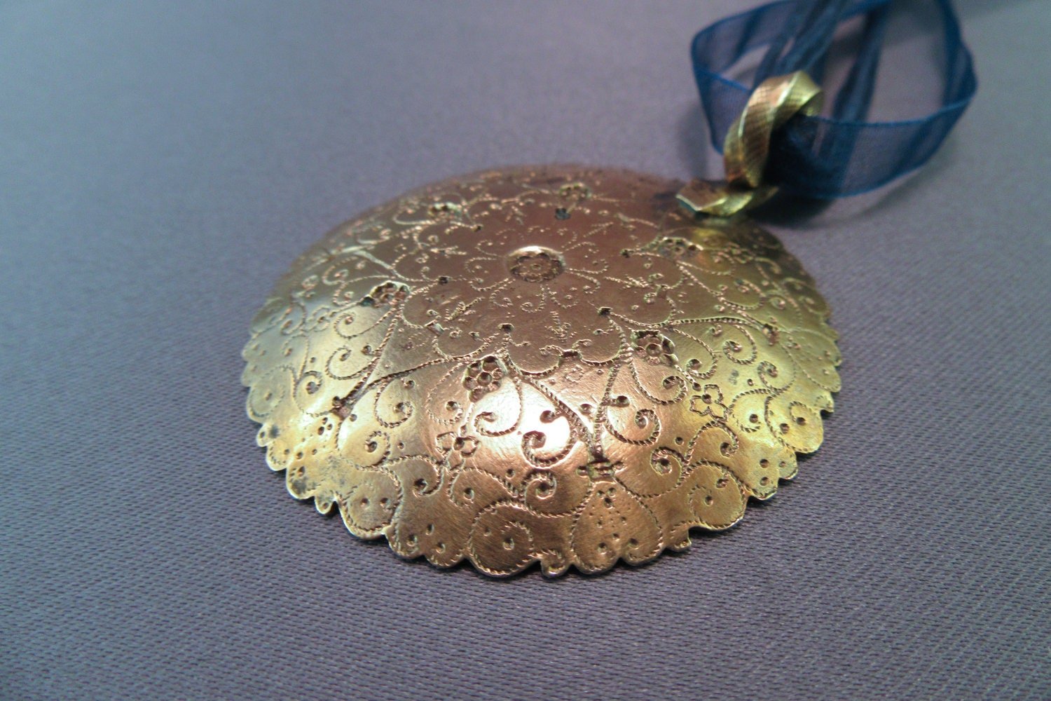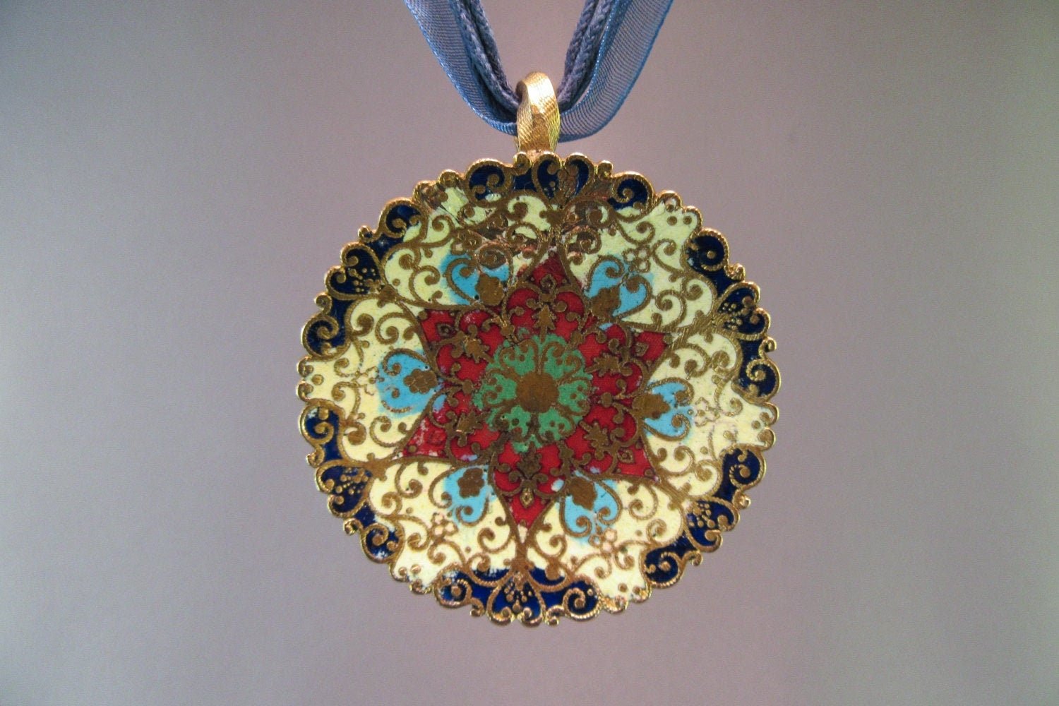 This dramatic, elegant pendant is made from a vintage brass spoon that features an ornate enameled design. It measures 2in X 2in.