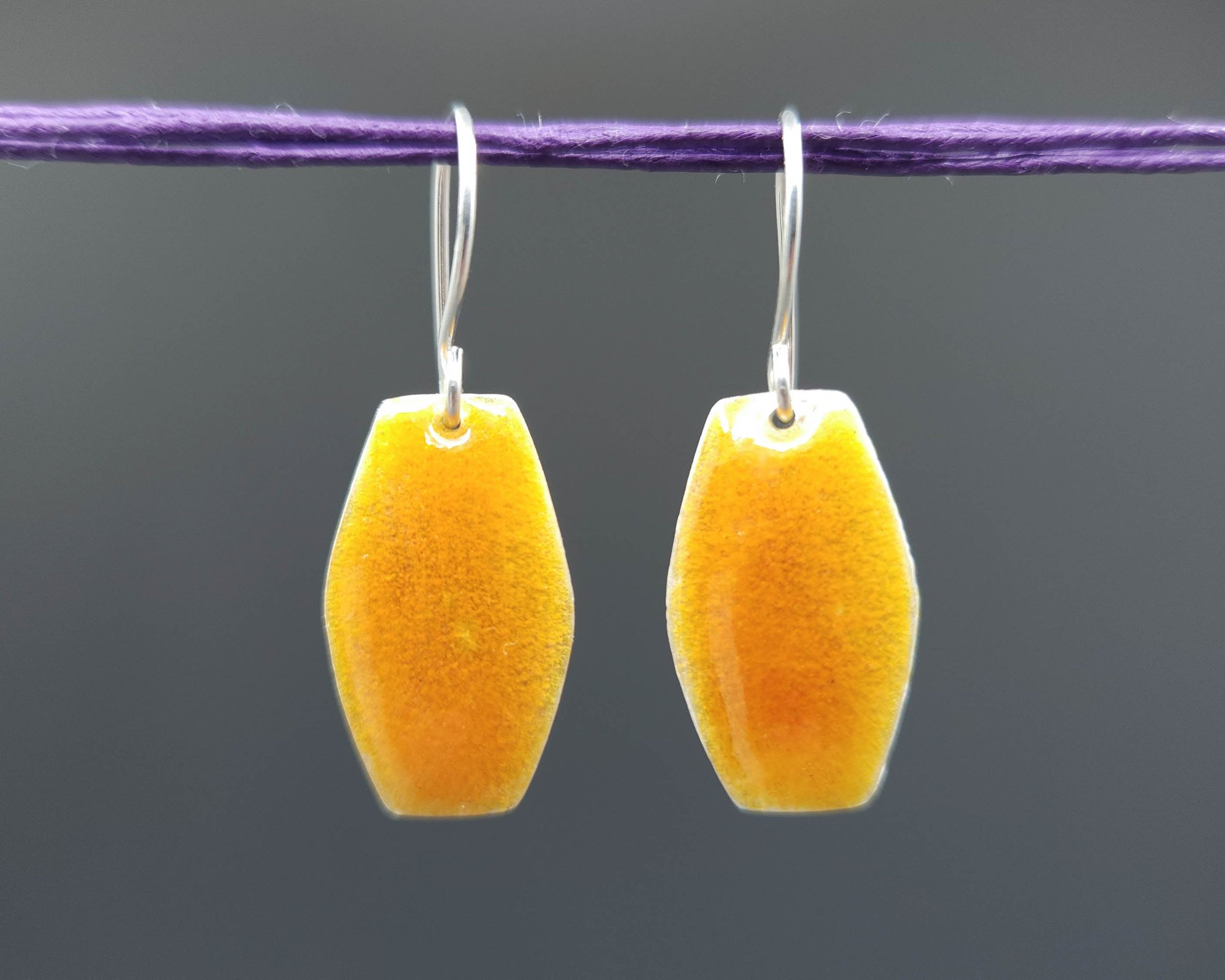 These artsy long hexagon-shaped earrings are made from textured fine silver and orange glass enamel. The ear wires are handmade from sterling silver. The earrings are 1/2" wide, 7/8" long and have a 1 3/8" dangle.